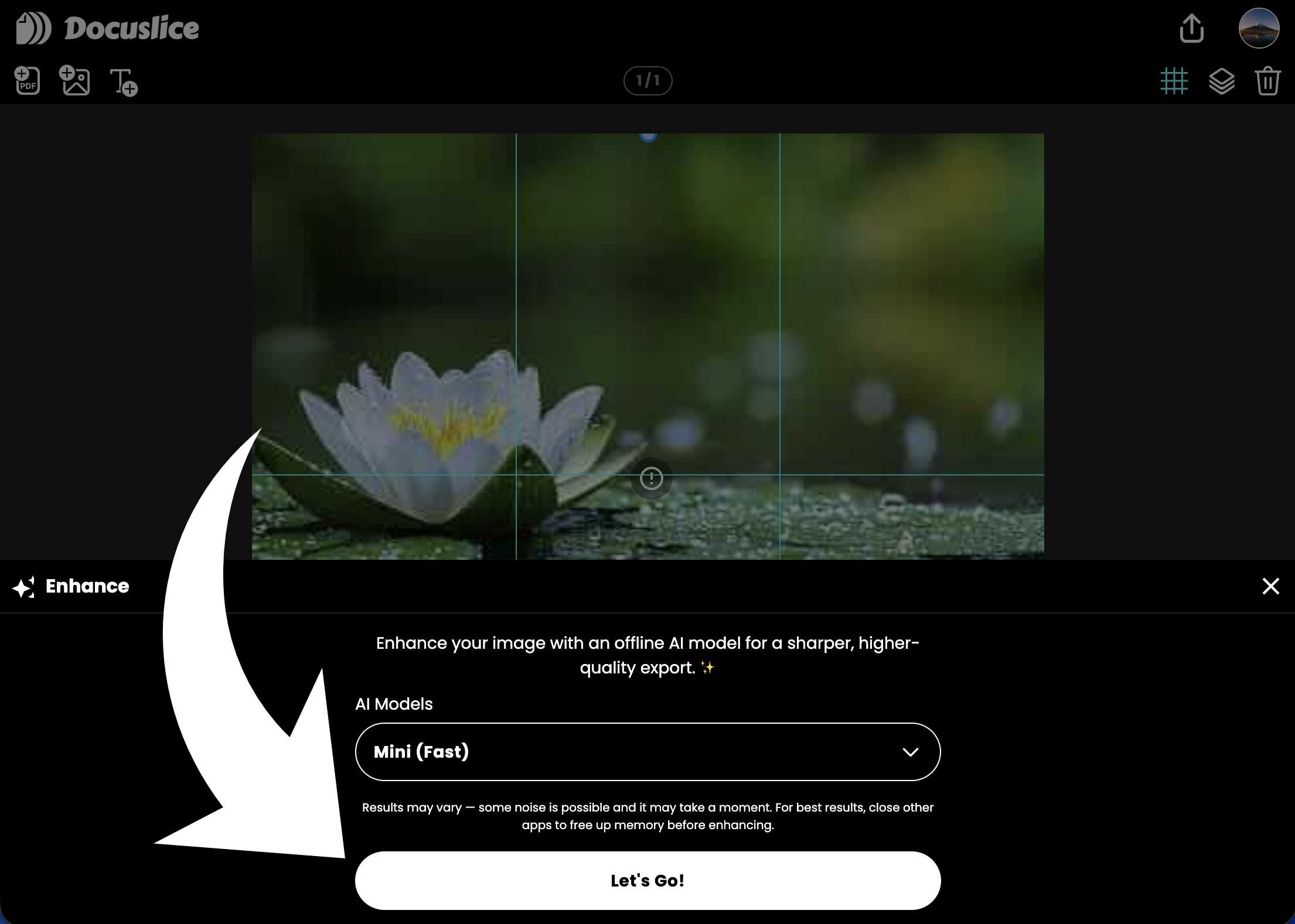 Hit Let's Go! to start. If this is your first time using the feature, Docuslice will download the AI model to your device first. This only happens once. - Wait for the enhancement to complete