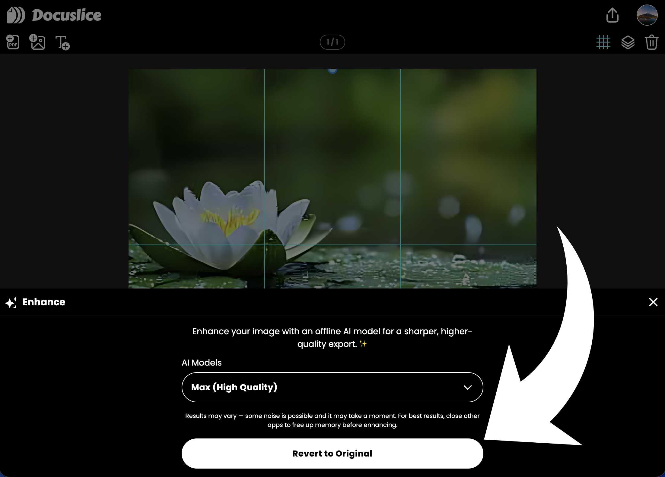 We're excited to introduce AI Photo Enhancement, a new feature in Docuslice that uses an on-device AI model to upscale and sharpen your images before you export — so your tiled prints come out looking their absolute best.